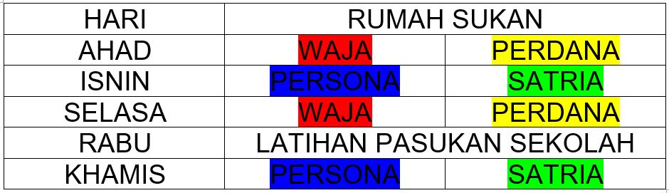 Rumah Sukan RUMAH WAJA RUMAH SATRIA RUMAH PERDANA RUMAH PERSONA Jadual Latihan Rumah Sukan *Waktu latihan bermula jam 4:30 petang hingga 6:00 petang Share this: Share on X (Opens in new window) X Share on Facebook (Opens in new window) Facebook More Share on Telegram (Opens in new window) Telegram Share on WhatsApp (Opens in new window) WhatsApp Like Loading...